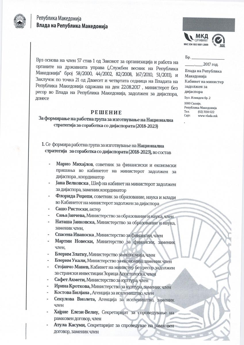 Министерот во Владата на Република Македонија Едмонд Адеми задолжен за дијаспората, после едномесечните консулатации денес ја потпиша одлуката за формирање на работна група за Националната стратегија за соработка со дијаспората која ја сочинуваат претставници на министерствата кои имаат надлежности во области важни за дијаспората, и претставници од граѓански организации, и индивидуалци, кои работат на прашања и теми врзани за дијаспората.