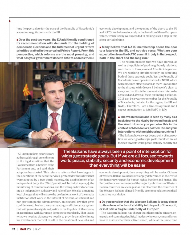 „Тоа сметаме дека ја релаксира политичката клима, заедно со изградбата на едно општество за сите граѓани. Во тек се ефикасни промени во здравството и во образованието, а децентрализираме и многу сервиси на локално ниво, за граѓаните да имаат достапни услуги. Република Македонија по Устав е социјална држава и наш предизвик е да се справиме со сиромаштијата што ја затекнавме како состојба, но во меѓувреме и да обезбедиме соодветна социјална заштита на секој кој има потреба од неа. Надворешните приоритети, евро-атлантските интеграции, значат и реални шанси за поефикасно остварување на домашните приоритети, а со тоа и целосна стабилизација на граѓаните и државата“, вели премиерот Заев во интервјуто за магазинот CorD, во кое одговара и на повеќе други прашања за регионот, за односите со соседите, како и за геостратешките прашања поврзани со Република Македонија и Западен Балкан.