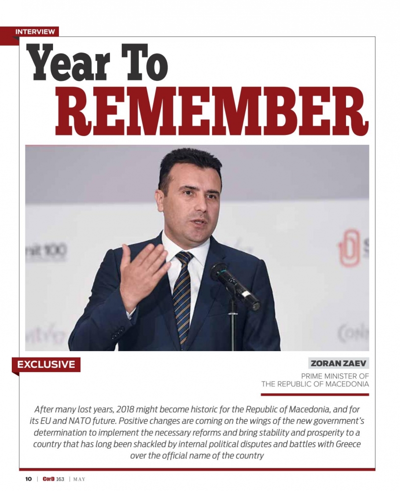 „Ако се насочиме сите кон изнаоѓањето решение, 2018 година може да биде година за паметење и за Република Македонија, но и за регионот, и за ЕУ и за НАТО. Затоа, неуморен оптимист сум и очекувам во јули покана на Македонија за влез во НАТО“, вели меѓу другото премиерот Зоран Заев во интервјуто за магазинот CorD, кој се печати во Белград, а за свои читатели ги има претставниците на дипломатскиот кор во земјите во регионот, како и јавноста во земјите од Балканот.