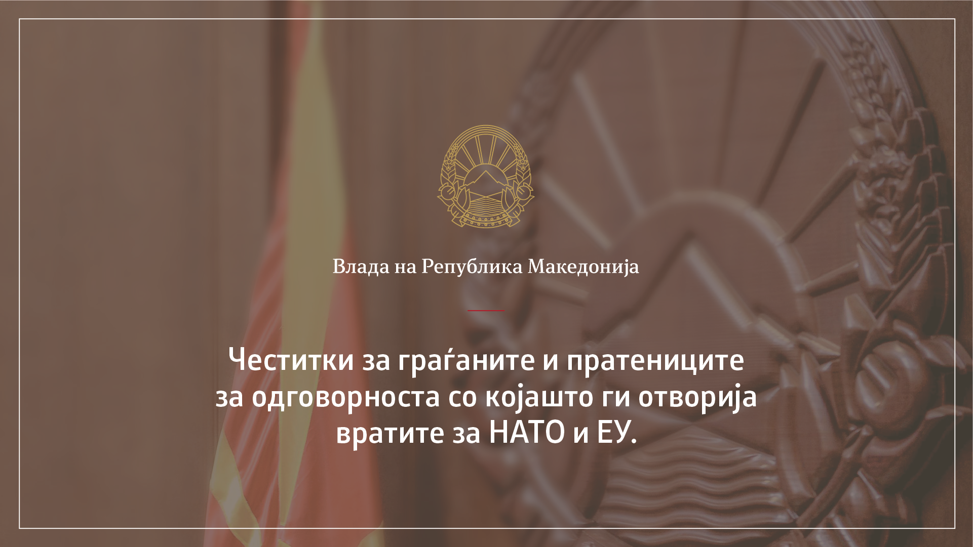 The Government of the Republic of Macedonia expresses gratitude to all citizens and to all supporters and partners of our country, for the great and significant support through the whole process of accepting the Prespa Agreement, with which we are securing our country’s future as member of NATO and The EU.