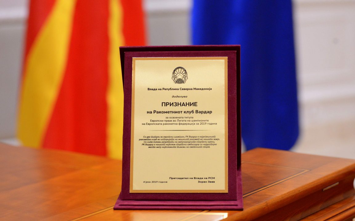 „Со сите големи резултати на меѓународните спортски арени РК „Вардар“ е нашиот најголем спортски амбасадор со најдостојно место меѓу најголемите тимови на светскиот спорт“, се вели во признанието потпишано од премиерот Заев.