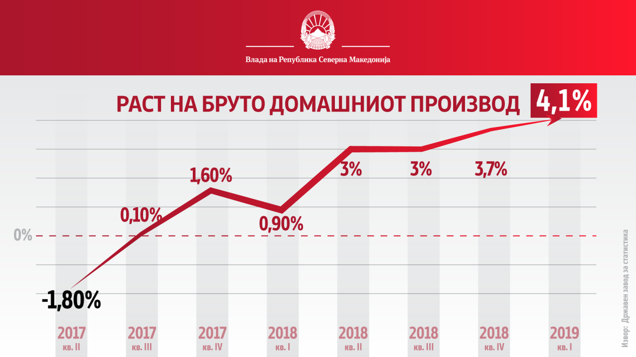 Задоволство ми е да соопштам дека растот на бруто домашниот производ во првиот квартал изнесува 4,1 %, што е највисокиот квартален износ во последните две години.