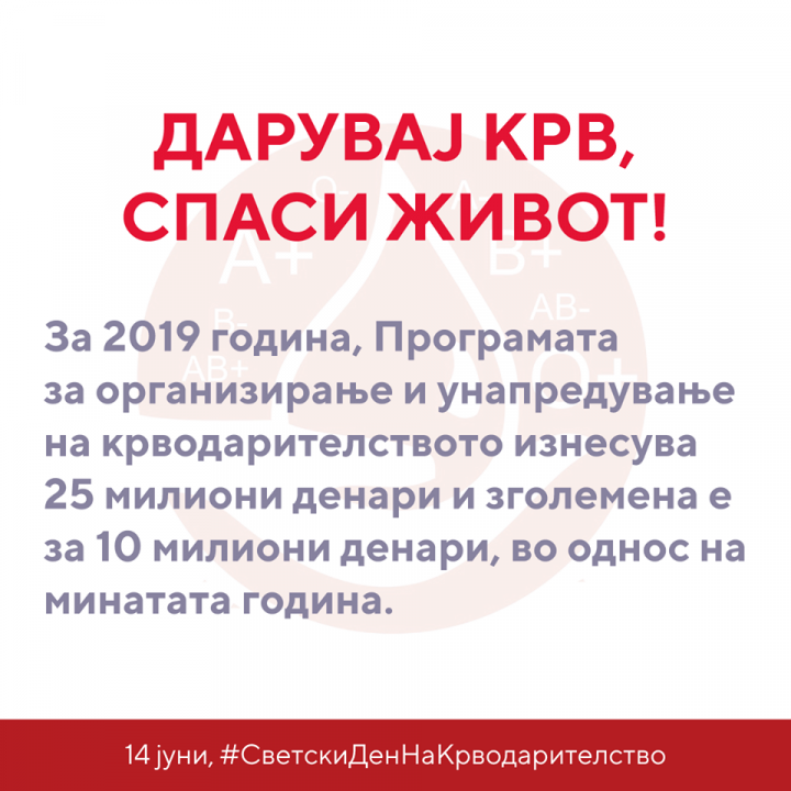 Министерството за здравство, секоја година изготвува посебна програма за организирање и унапредување на крводарителството во државата. За оваа 2019 година, програмата изнесува вкупно 25 милиони денари и зголемена е за 10 милиони денари, во однос на минатата година.