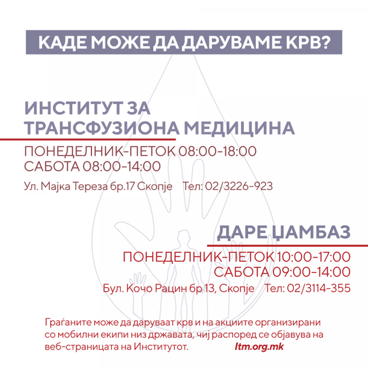 (02)3226-923, локал 125 при Институтот за трансфузиона медицина на Република Северна Македонија. Службите за трансфузиона медицина се наоѓаат во кругот на општите и клиничките болници низ градовите во државата, така што граѓаните може да даруваат крв и на тие места.