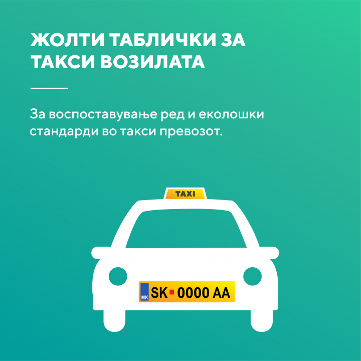 „На барање на здруженијата за авто -такси превоз се воведуваат жолти таблици за такси возилата, со цел да се постигне ред во такси превозот, односно да се препознаваат лиценцираните и регистрираните такси возила, и ќе се спречи нелојалната конкуренција во оваа дејност односно забрана за вршење на нерегистрирана дејност. Исто така се воведува и унифицирана светлечка табла за такси возилата“ информираше министерот Бектеши.