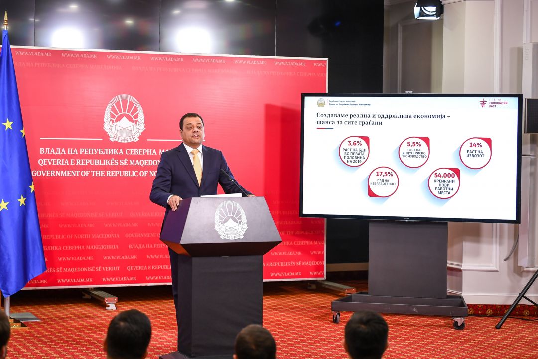 Воедно, ако се спореди периодот од јануари до септември 2019 година во споредба со истиот перид во 2018 година, бележиме раст од 5,6% на индустриското производство од кои само во последните месеци се гледа забрзан раст и тоа во август 2019 наспроти август 2018 година - 9,8% и септември 2019 наспроти септември 2018 година - 6,1%. Извозот од државата расте со стапка од 14%, невработеноста како резултат на ова, се разбира, паѓа. Се вработија 54.000 граѓани во овие две години и невработеноста падна на најниските 17,5%“, потенцира вицепремиерот Анѓушев.