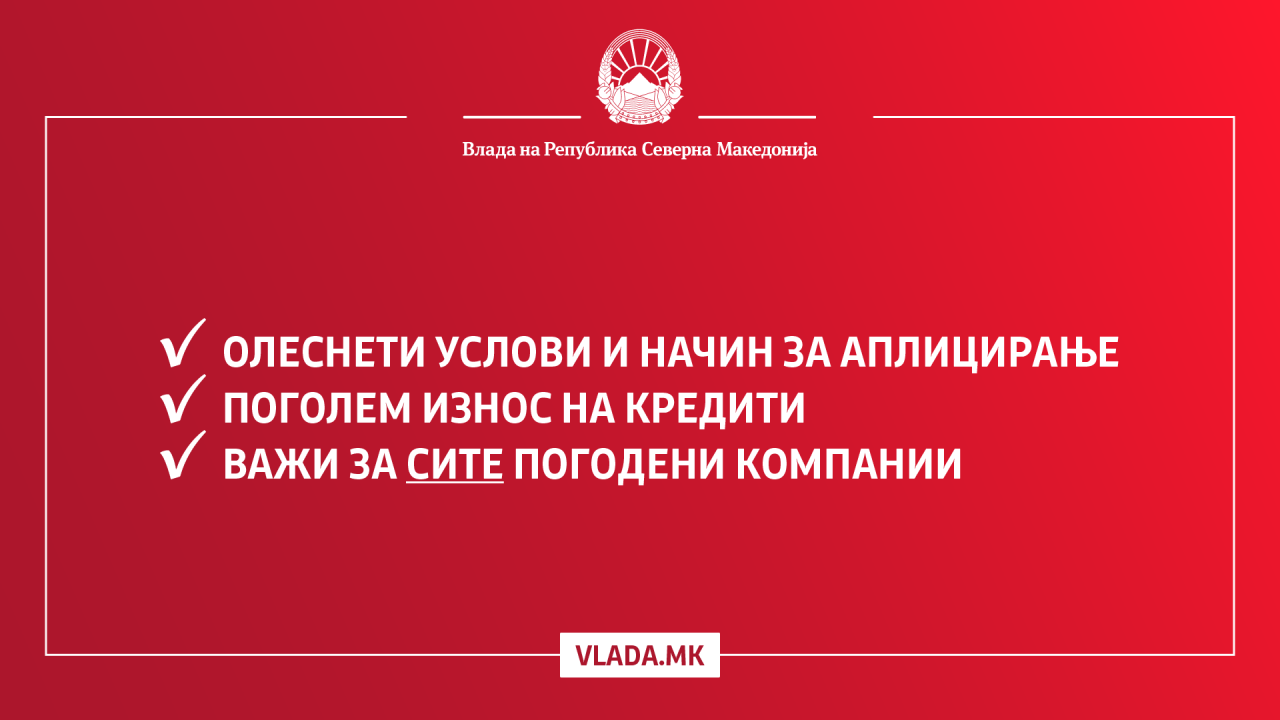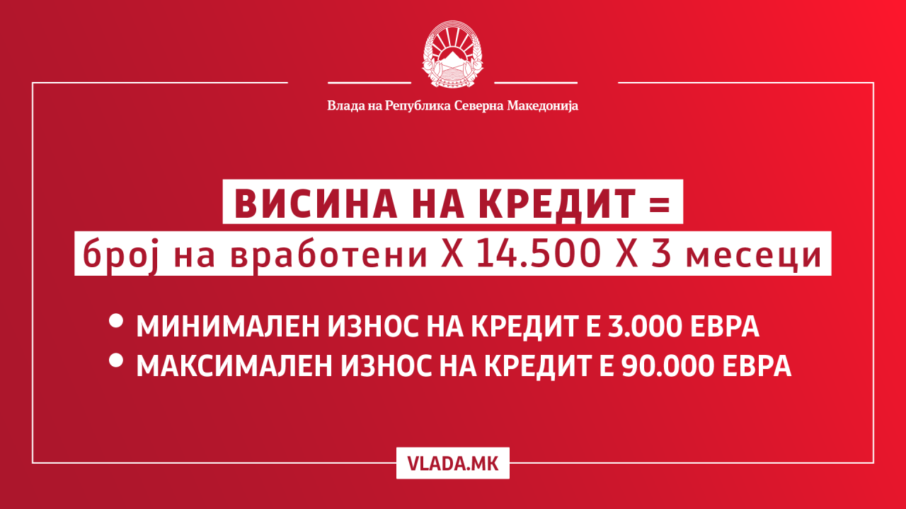 „Аплицирањето ќе биде електронски, по примерот на „Ковид1“. Иако износот на кредит се пресметува по формулата 14.500 х 3 месеци х број на вработени, најмалите претпријатија не се заборавени. Микро претпријатијата до 5 вработени, ќе може да аплицираат за бескаматен кредит во износ од 3.000 евра“, додаде Наумов.
