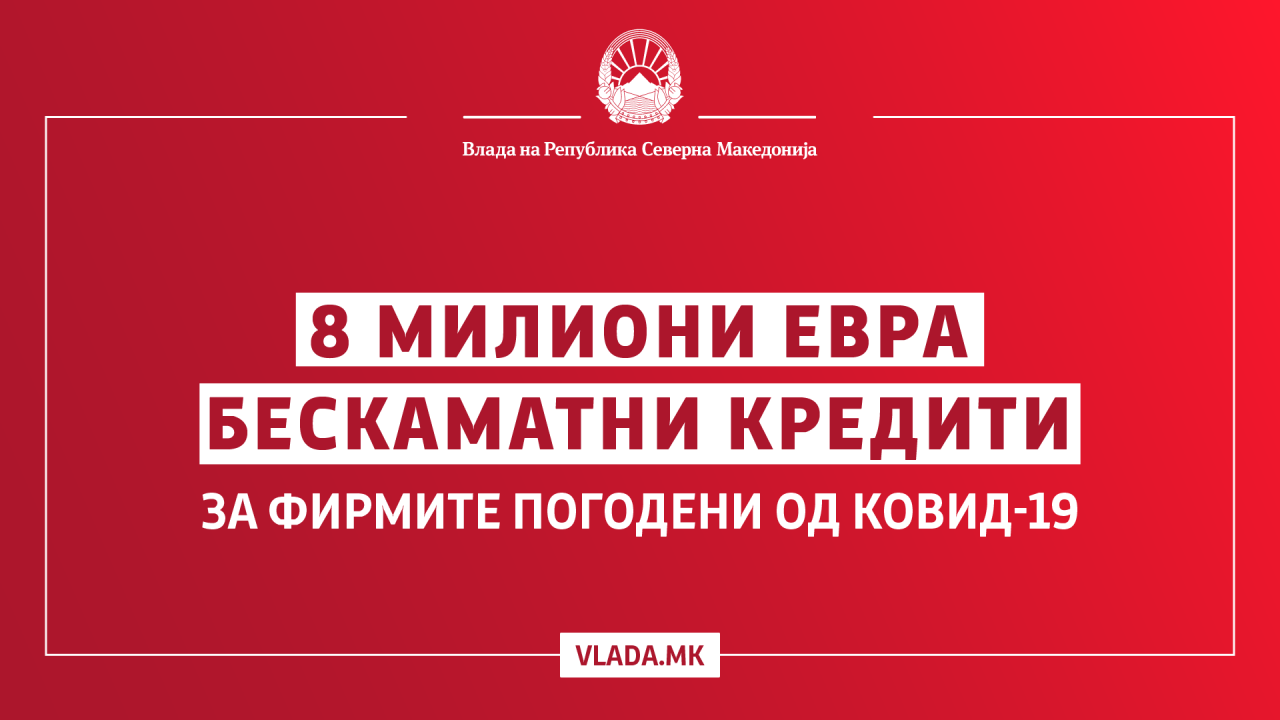 Од среда, 29-ти април микро, малите и средни компании од сите дејности, погодени од КОВИД-19 кризата, ќе можат да аплицираат за 8 милиони евра бескаматни кредити, преку Развојната банка на Северна Македонија. Кредитите од оваа линија ќе бидат до 90.000 евра, а условите и постапката за аплицирање се олеснети. На јавната презентација на новата бескаматна линија, која е антикризна мерка за справување со коронакризата, присуствуваа министерката за финансии Нина Ангеловска, директорот на Развојната банка, Кире Наумов, директорката на Централниот регистар Марија Бошковска Јанковски и преку видео изјава амбасадорката на Јапонија во земјава, Кеико Ханеда.