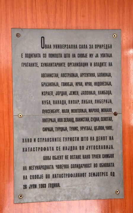 Министерката за култура потсети на содржината на спомен плочата која е поставена до билетарницата во Универзалната сала и нагласи дека овој објект претставува траен симбол на човечката солидарност на многу земји и граѓани кои помогнале на Скопје во најтешките моменти.