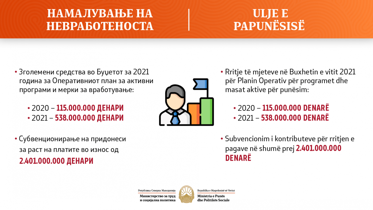 Таа укажа на тоа дека, заради намалување на стапката на невработеност и оваа година се обезбедуваат средства за Оперативниот план за активни програми и мерки за вработување, во износ од 538 милиони денари.