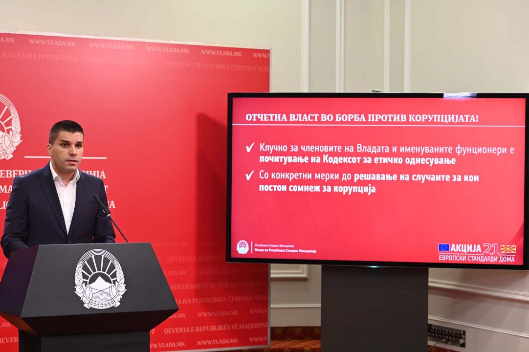 Заменикот на Претседателот на Владата задолжен за борба против корупцијата и криминалот, одржлив развој и човечки ресурси, Љупчо Николовски, на денешната прес-конференција ги презентираше идните владини мерки во реализацијата на вториот приоритет од владината рамка „Акција 21 – европски стандарди дома“, односно борбата против корупцијата и криминалот.