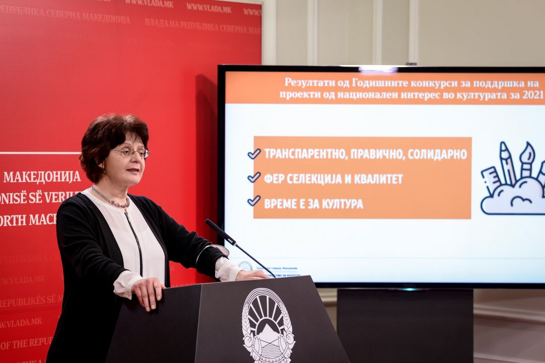 „Во еден ваков сложен и крајно проблематичен контекст, и комисиите и јас како министерка, зазедовме став за една суштинска позиција: да се обезбеди одговорна, транспарентна и праведна дистрибуција на парите на даночните обврзници за културата“, истакна министерката за култура, Ирена Стефоска на денешната прес-конференција на која информираше за резултатите од Годишните конкурси за финансирање проекти од национален интерес во културата за 2021 година по дејности и области.