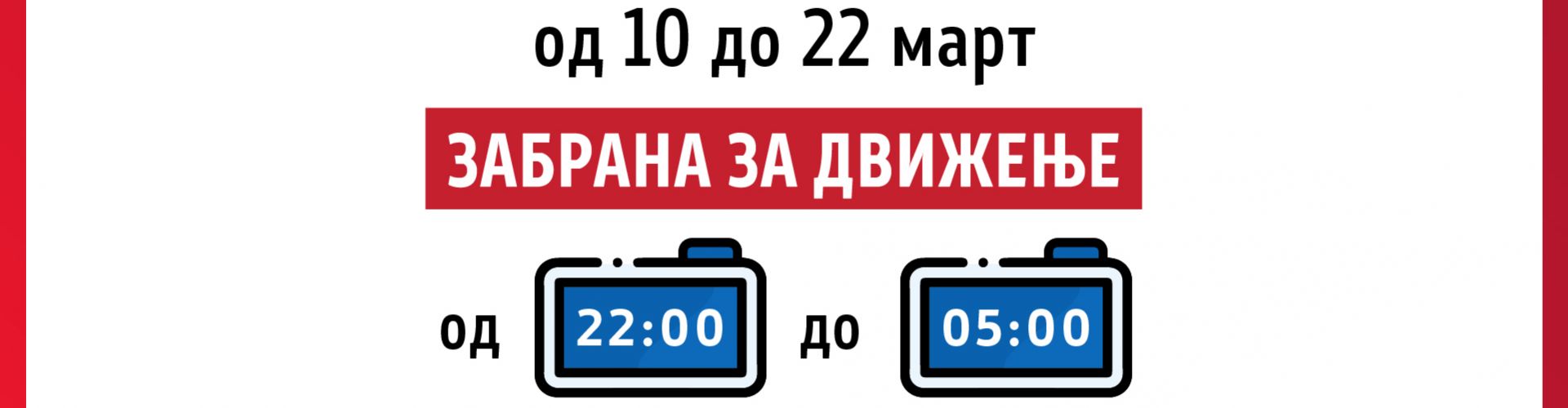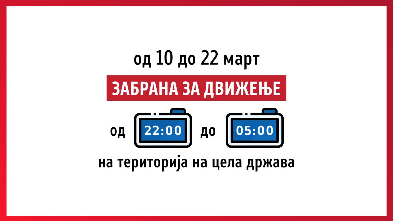 Në mbledhjen e sotme të Qeverisë, u soll vendim për ndalesën e lëvizjes së popullsisë dhe automjeteve të transportit publik në territorin e Republikës së Maqedonisë së Veriut, në periudhë kohore prej orës 22:00 deri në orën 05:00 ditën e ardhshme, duke filluar prej 10 mars 2021 (e mërkurë) deri më 22 mars 2021 (e hënë).