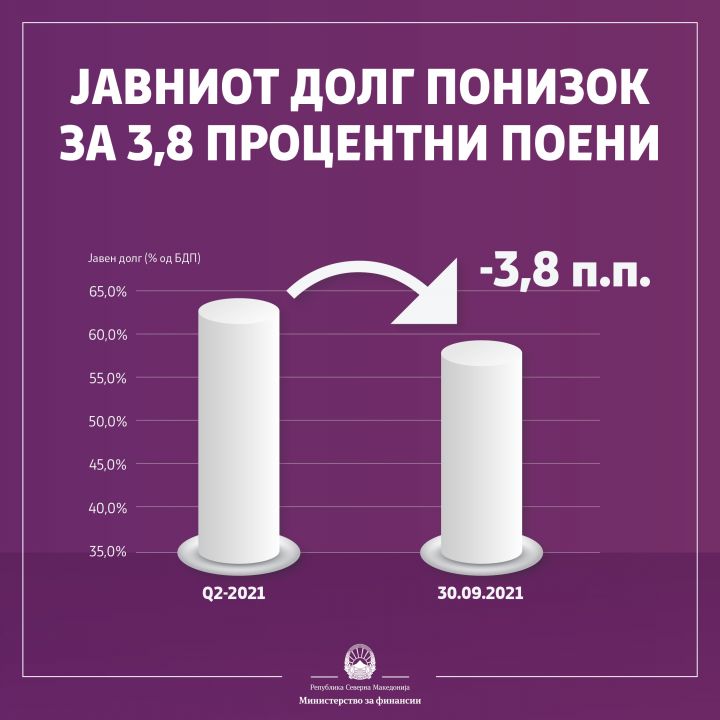 Kriza e shkaktuar nga COVID-19 dhe ballafaqimi me pasojat imponoi nevojën për sigurim të mjeteve shtesë për masat në sektorin shëndetësor, përkrahjen e ekonomisë dhe qytetarëve, që ndikoi në rritjen e borxhit gati në të gjitha vendet, duke përfshirë edhe vendin tonë. Por, politikat e duhura dhe masat e ndërmarra në kohë, të cilat kapën vlerën prej 1 miliardë eurove, treguan se vendi mund të ballafaqohet me krizën, duke siguruar gjithashtu edhe konsolidim fiskal. Borxhi publik në fund të vitit 2020 ishte 60.2%, në tremujorin e parë të vitit 2021 ishte 61.2%, në tremujorin e dytë të vitit 2021 ishte 63.1% dhe tash në fund të tremujorit të tretë shënoi ulje në 59.3%.