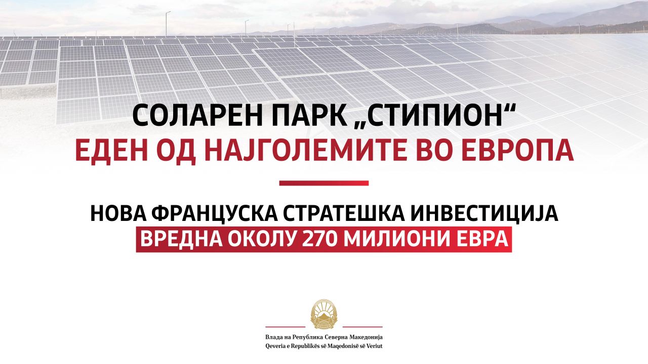 „Северна Македонија ќе добие соларен парк, кој ќе биде еден од најголемите во Европа со капацитет за производство на електрична енергија од 360 до 400 мегавати (MW). Станува збор за директна француска гринфилд инвестиција најголема во овој домен, за македонската економија. Соларниот парк „Стипион“ ќе се гради во текот на 2022 година на локацијата која беше предвидена за изградба на карго аеродромот во Штип на површина од 452 хектари“, рече премиерот Зоран Заев на денешната промоција на инвестицијата во присуство на амбасадорот на Франција Сирил Бомгартнер, како и претставници на менаџментот на француската компанија „Акио Енерџи“.