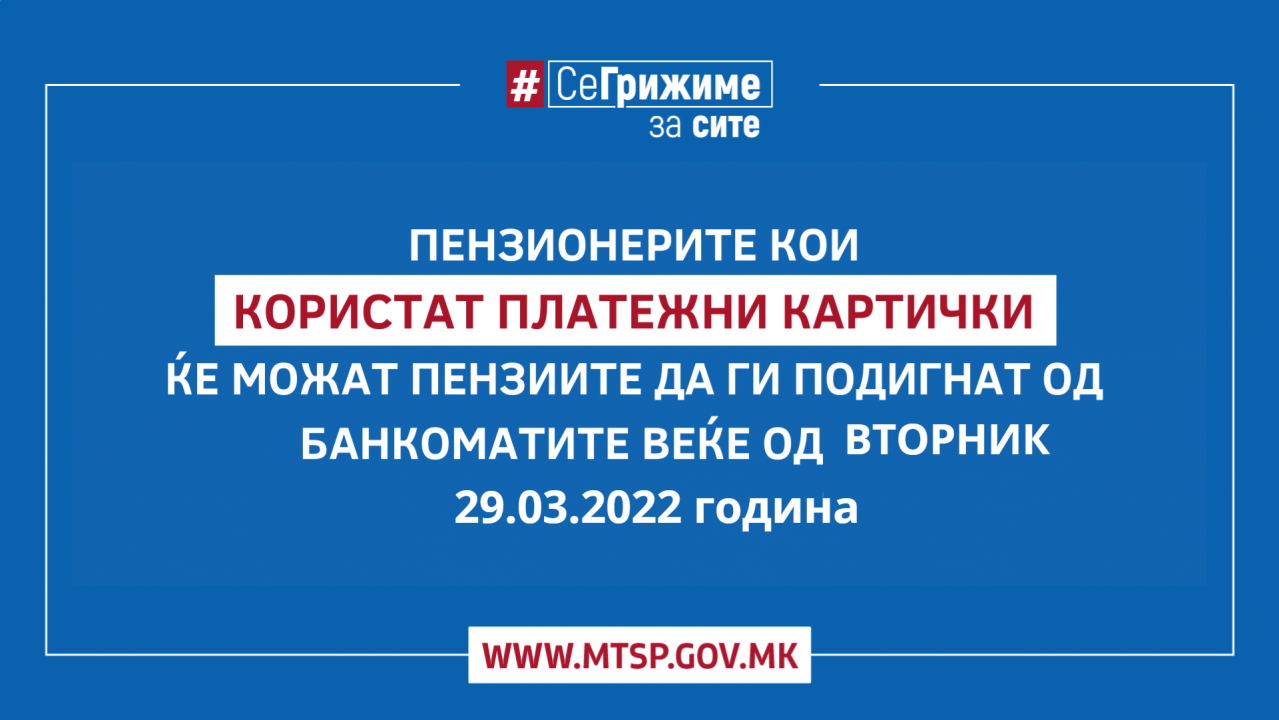 Министерството за труд и социјална политика известува дека од утре 29.03.2022 год. (вторник) започнува етапната исплата на мартовските пензии. Пензиите ќе бидат исплатени предвреме и етапно, со цел да се овозможи поголема заштита на пензионерите во услови на опасност од  КОВИД-19.