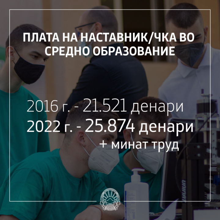Me dialog konstruktiv me sindikatat që janë partneri ynë i fortë, pagat e punonjësve në arsim dhe mbrojtjen e fëmijëve në periudhën 2017-2022 janë rritur për 21%. Me rritjen e fundit, një mësues/mësuese i/e shkollës fillore tani merr pagë prej 24.786 denarë, plus për punën e kaluar, që është një rritje prej 3.267 denarë plus për punën e kaluar, për dallim nga viti 2016 kur paga e tij ishte 21.521 denarë. Te mësimdhënësit në arsimin e mesëm paga tani është 25.642 denarë dhe është rritur për 4.353 denarë plus për punë të kaluar.