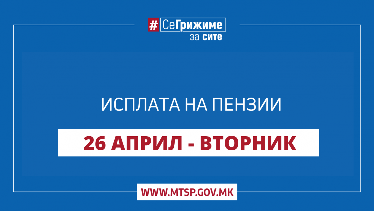 Министерството за труд и социјална политика известува на ден 26.04.2022 год. (вторник) започнува етапната исплата на априлските пензии.