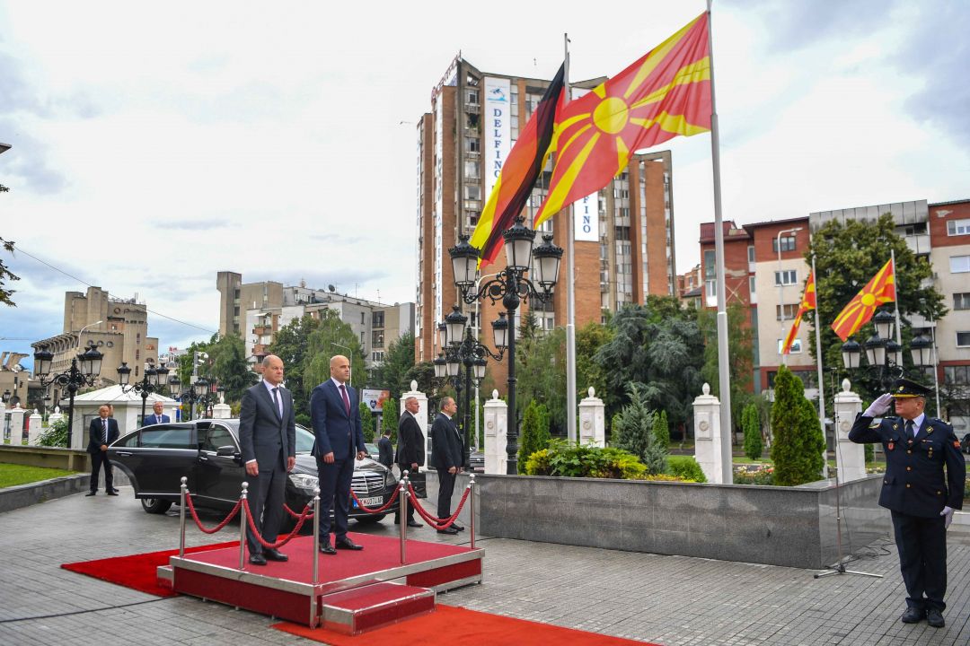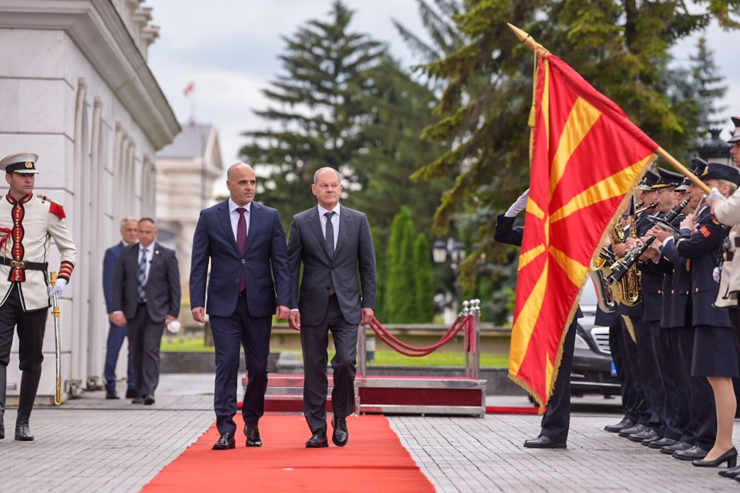 Канцеларот Шолц и неговата делегација беа пречекани со највисоки државни и воени почести и со интонирање на државните химни на Република Северна Македонија и Сојузна Република Германија, по што започна работниот дел од посетата.
