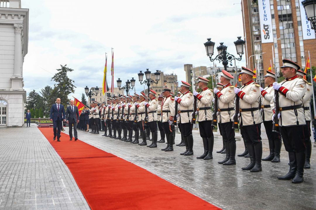 Претседателот на Владата на Република Северна Македонија Димитар Ковачевски, на платото пред Владата, го пречека канцеларот на Сојузна Република Германија Олаф Шолц, кој пристигна во еднодневна официјална посета на нашата земја.