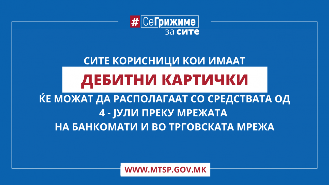 Корисниците на парични права коишто поседуваат дебитна картичка ќе можат да подигнат готовина на банкоматите на банките, да ги користат средствата за безготовински плаќања во продажната мрежа или преку електронско и мобилно банкарство од денеска, 4 јули 2022 година.