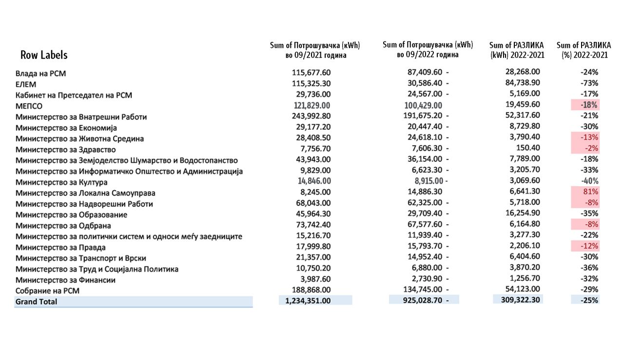 Согласно податоците, заштедата на електрична енергија во зградата на Владата е 25%, кај Министерство за внатрешни работи 21%, Министерство за култура 40 %, Министерството за образование 35%, Министерство за политички систем 22%, Министерство за транспорт и врски 30%, Министерство за труд и социјална политика 36%, Министерство за финансии 32%, Министерство за економија 30%.