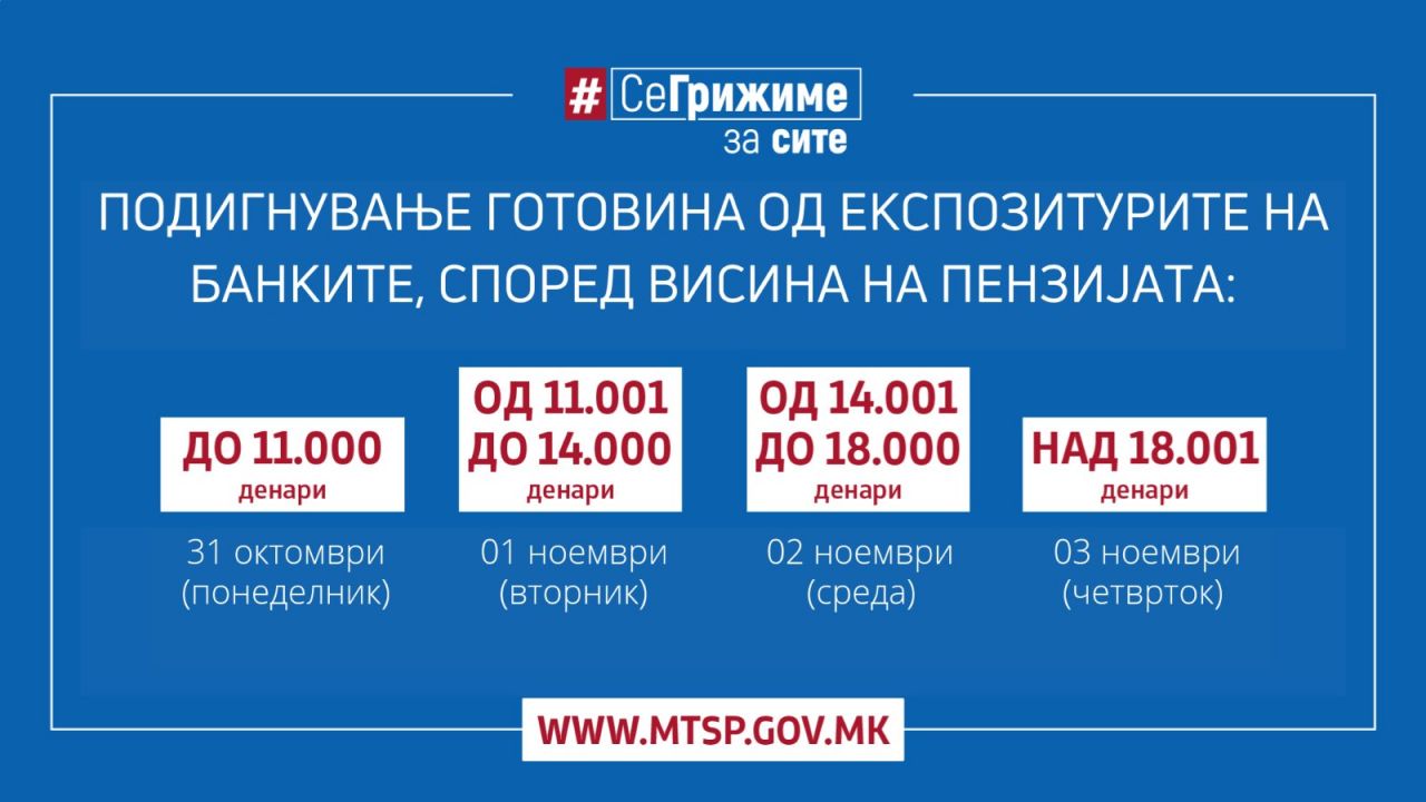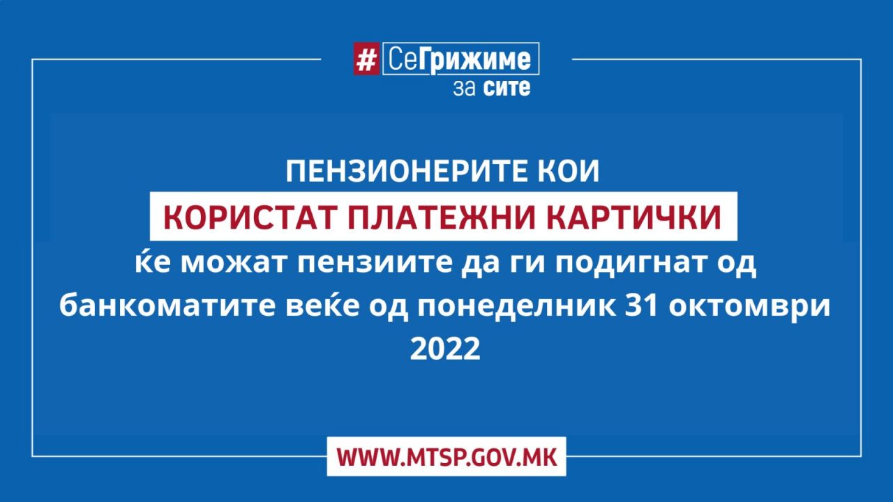 Министерството за труд и социјална политика известува дека на ден 31.10.2022 година (понеделник) започнува етапната исплата на пензиите за месец октомври, кои продолжуваат да се исплатуваат предвремено.