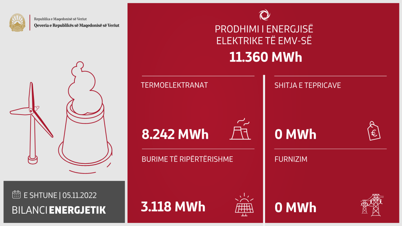 Соработникот Андонов го презентираше и дневниот енергетски биланс за 05.11.2022 година и истакна дека на вчерашниот ден се произведени се вкупно 11.360 мегават часови, од кои во термо електраните се произведени 8.242 мегават часови, додека од обновливи извори произведени од ЕСМ во кои се сметаат хидроелектраните и ветерниот парк во Богданци, произведени се 3.118 мегават часови електрична енергија, со што целосно се задоволени се потребите на малите потрошувачи и домаќинствата.