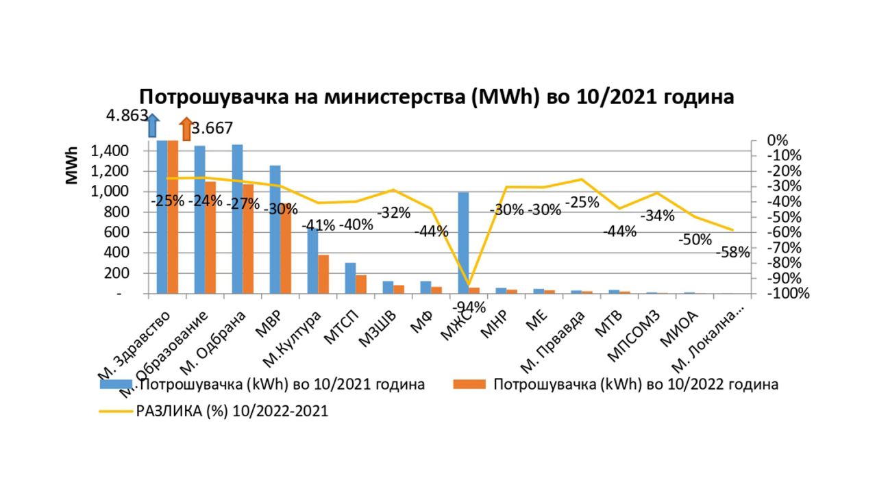 Согласно податоците потрошувачката на електрична енергија само на министерствата сумирана заедно со сите единици кои се во склоп на надлежностите под одредено министерство е намалена за 33%.