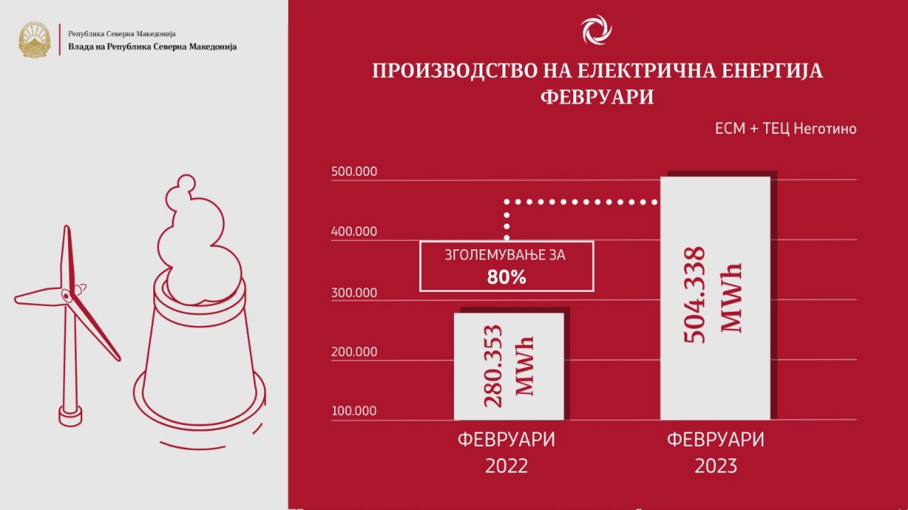 „Во месец февруари 2023 година, од капацитетите на ЕСМ и ТЕЦ Неготино произведени се вкупно 504.338 MWh електрична енергија, и споредено со февруари 2022 година, кога производството на електрична енергија изнесувало 280.353 MWh, преставува зголемување за 80%. Во првите два месеци од оваа година, јануари и февруари, вкупното производство на електрична енергија од капацитетите на ЕСМ и ТЕЦ Неготино изнесува 1.065.689 MWh, и споредено со истиот период во 2022 година, кога било 714,362 MWh, и преставува зголемување за 49%“, рече соработникот Андонов.