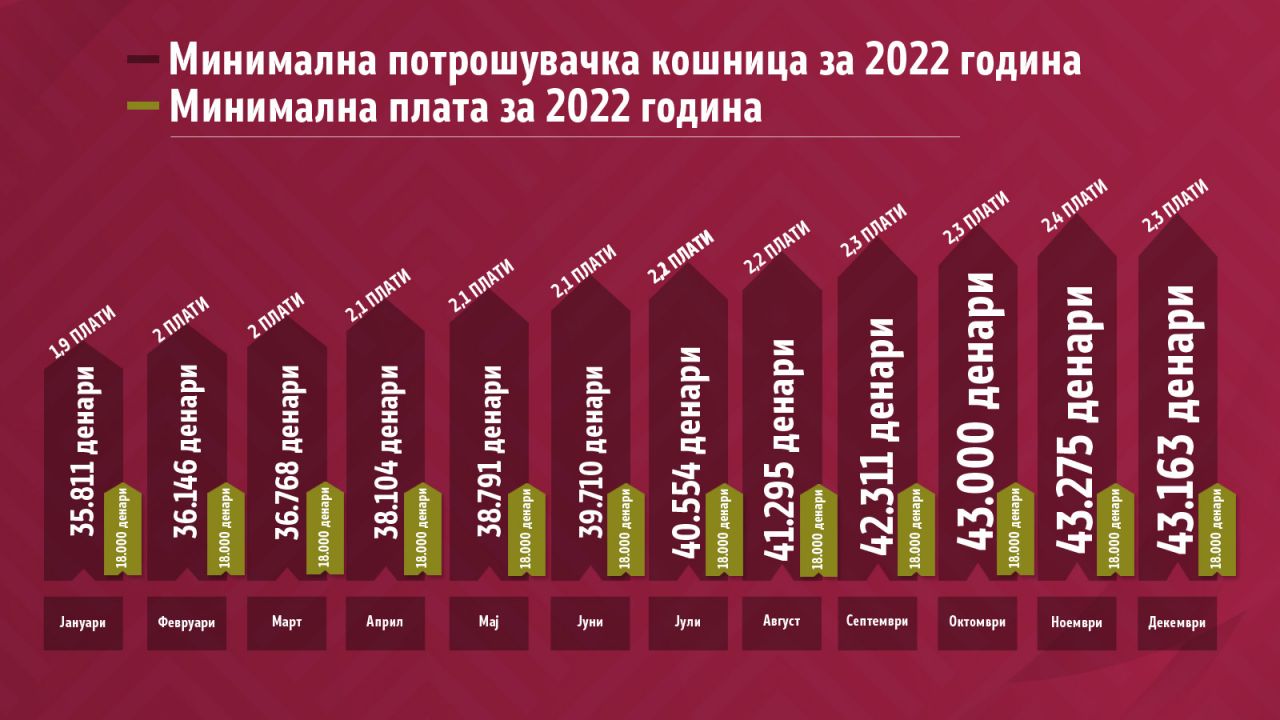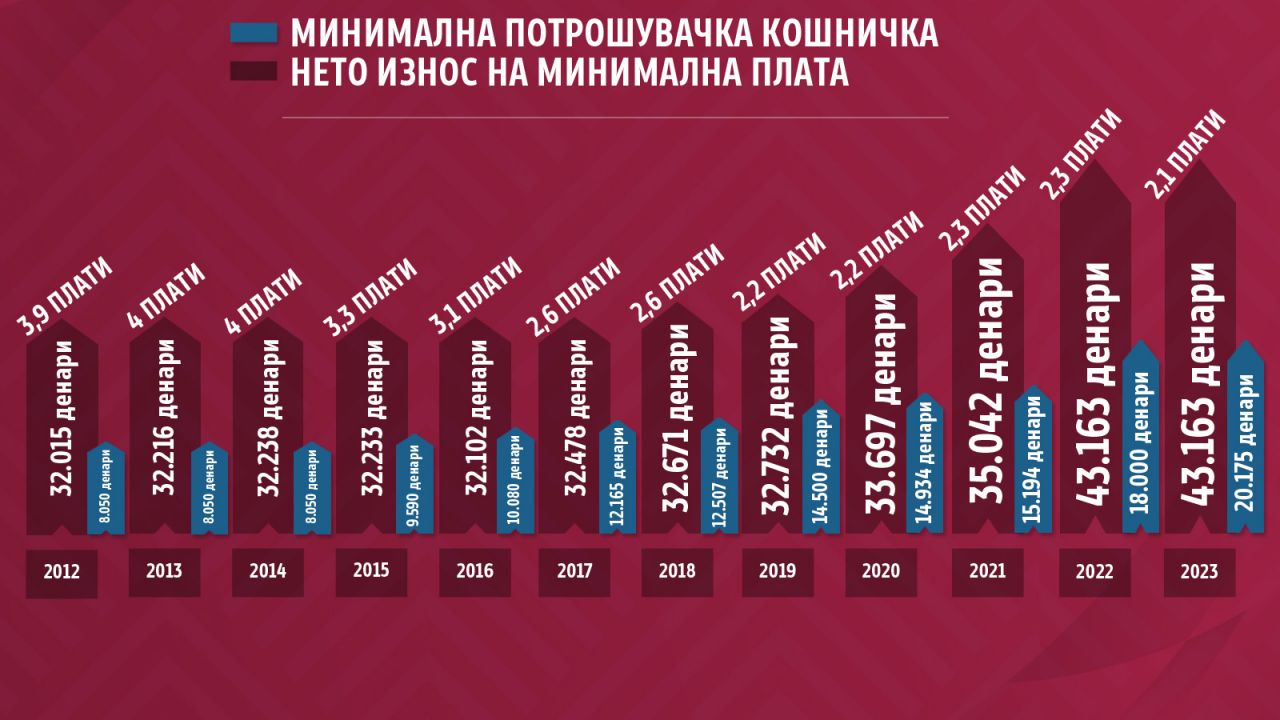 За да се покрие една минимална потрошувачка кошница која ја објавува Сојузот на синдикати на Македонија потребни се две минимални плати. Во методологијата на