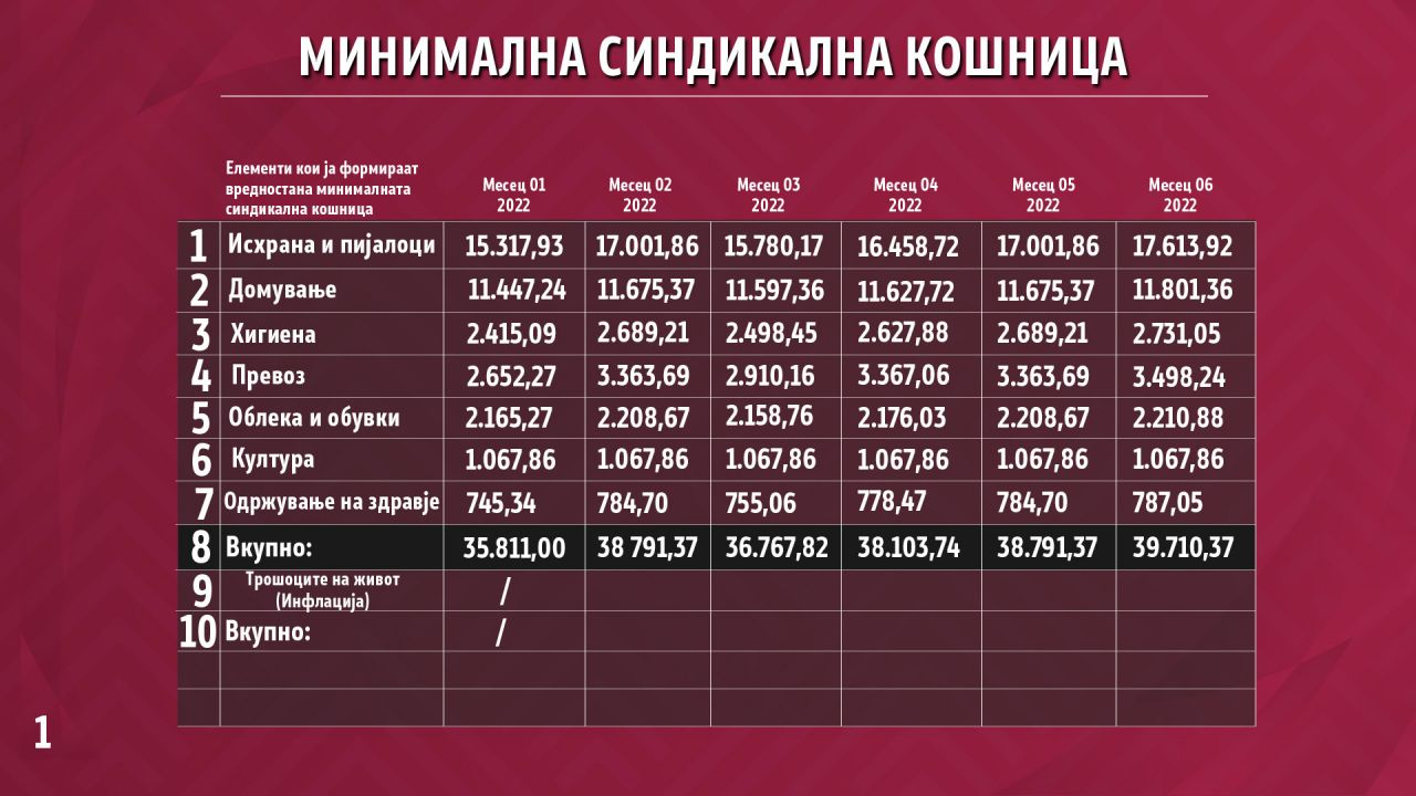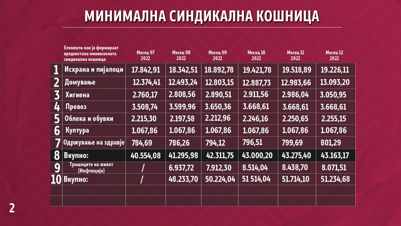 „Почнувајќи од август може да се види дека има дополнителна ставка во пресметката на минималната кошница, односно дополнително се пресметува инфлацијата, иако внатре во секој елемент поединечно има пресметано инфлација, посебно во делот на храна и пијалоци, посебно во делот на облека и обувки, посебно во делот на превоз, итн... Но во осмиот месец минатата година може да се види од пресметката на минималната потрошувачка кошница на Соуозот на синдикати има уште еден додаден елемент односно ставка во пресметката, а тоа е инфлација. Тоа јасно покажува дека инфлацијата се пресметува два пати, што значи дека тој податок не треба да се зема во предвид“, појасни министерот.