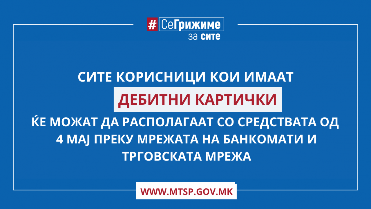 Корисниците на парични права коишто поседуваат дебитна картичка ќе можат да подигнат готовина на банкоматите на банките, да ги користат средствата за безготовински плаќања во продажната мрежа или преку електронско и мобилно банкарство од денеска, 4 мај 2023 година.
