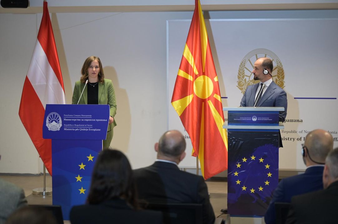 Në takimin me ministren Pllakollm dhe sekretaren shtetërore për Çështjet Evropiane Grashiç, biseduam për përforcimin e bashkëpunimit në integrimet evropiane dhe lidhjen institucionale, bashkëpunimin ekonomik, tranzicionin energjetik dhe zhvillimin e politikave të qëndrueshme në dobi të qytetarëve. Austria dhe Sllovenia janë ndër partnerët tanë më konsekuent dhe mbështetës në procesin e aderimit drejt Bashkimit Evropian, por edhe në përpjekjet që Maqedonia e Veriut të mbetet shtytës i stabilitetit dhe reformave në rajon. Austria, përmes mbështetjes së saj aktive në kuadër të politikës së zgjerimit dhe përmes Agjencisë austriake për zhvillim, është e pranishme në më shumë segmente të proceseve tona reformuese: nga përforcimi i institucioneve dhe sundimi i ligjit, deri te zhvillimi ekonomik dhe mbrojtja e mjedisit jetësorë. Sllovenia, vendi me të cilin na lidh e kaluara e përbashkët dhe me të cilin kemi një traditë të gjatë miqësie dhe mirëkuptimi reciprok, është gjithashtu aleat i rëndësishëm në transmetimin e përvojave nga negociatat aderuese, në ndihmën teknike, si dhe në zbatimin e projekteve konkrete të mbështetura me mjete zhvillimore sllovene: në energjetikë, digjitalizim, arsim dhe zhvillim ekonomik lokal.