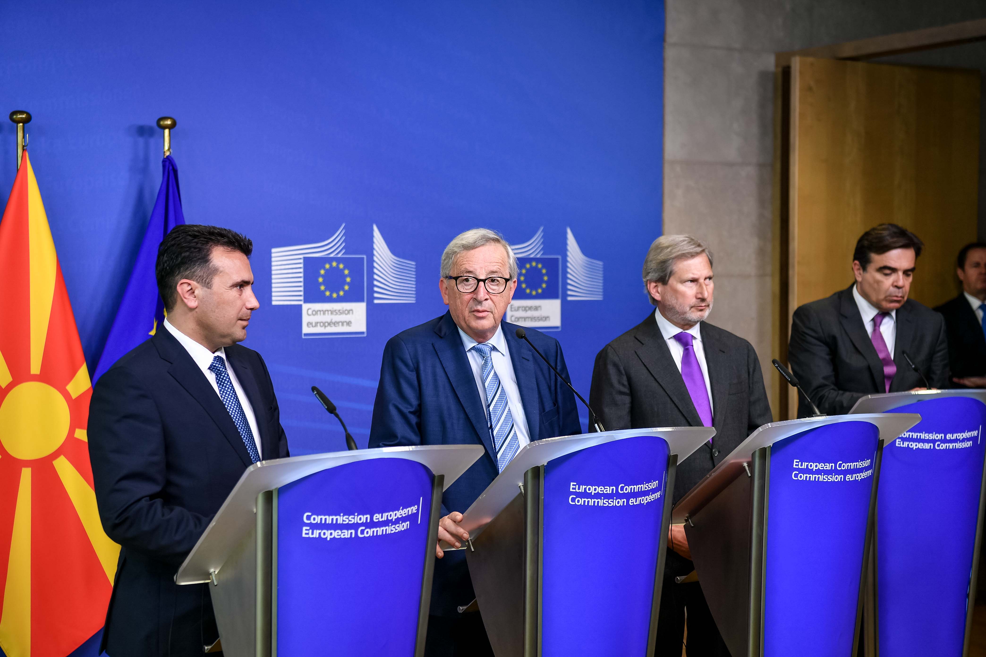 Премиерот Заев на прес со Претседателот на ЕК Јункер и еврокомесарот Хан: Европската комисија ја смести Северна Македонија и нејзиниот успех, на листата на најголемите достигнувања на Европската Унија, време е Европа да испорача